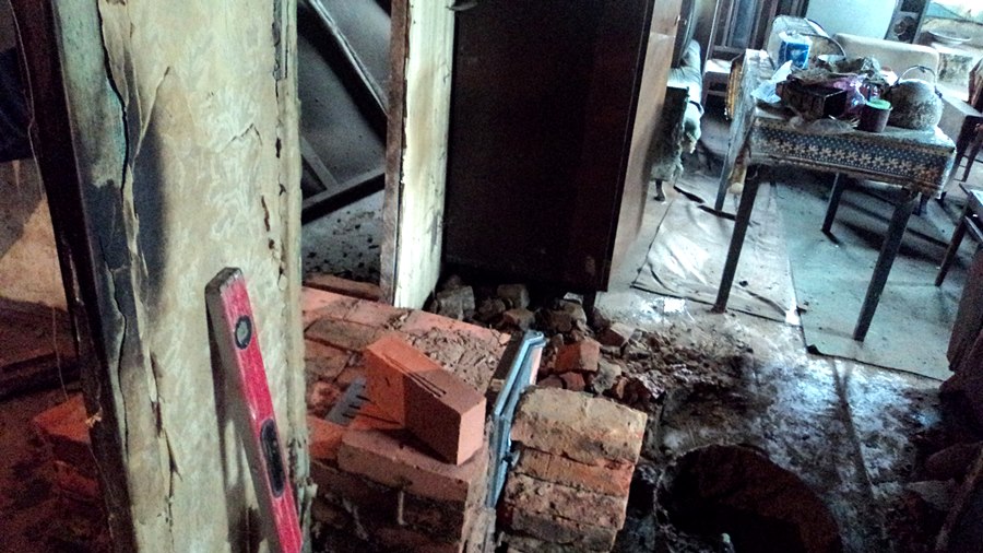 Один из наших визитов к Эдуарду Михайловичу совпал с работами в его доме людей из городского центра соцзащиты. Рабочие перекладывали пострадавшую от пожара печь и по мере возможности общались со стариком.