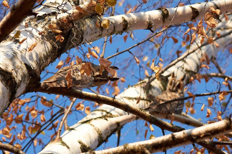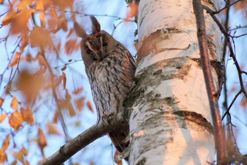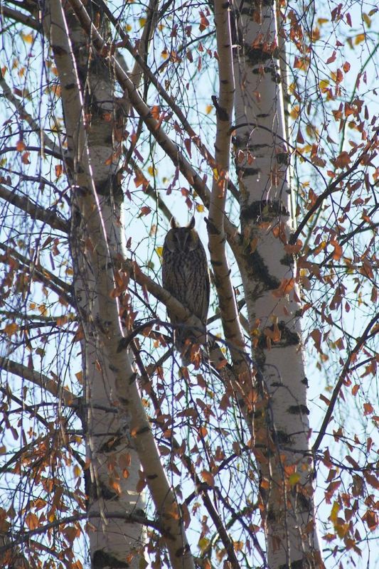 Автор снимков предполагает, что это ушастые совы. Этот вид встречается не только в лесных чащах, но и в довольно оживленных местах, даже в городах. Сама по себе эта небольшая птица, которую от соплеменников можно отличить по длинным перьевым "ушкам". Такая сова может поворачивать голову на 210 градусов.