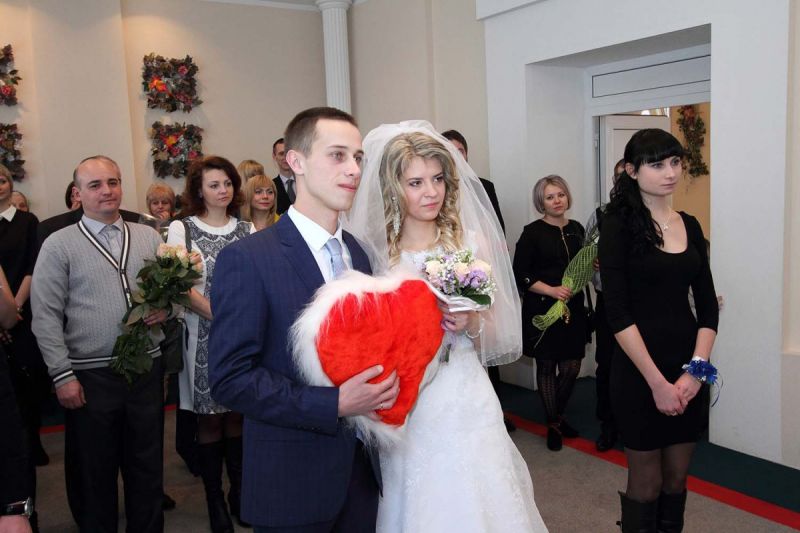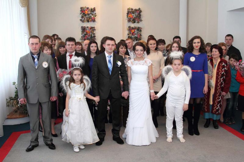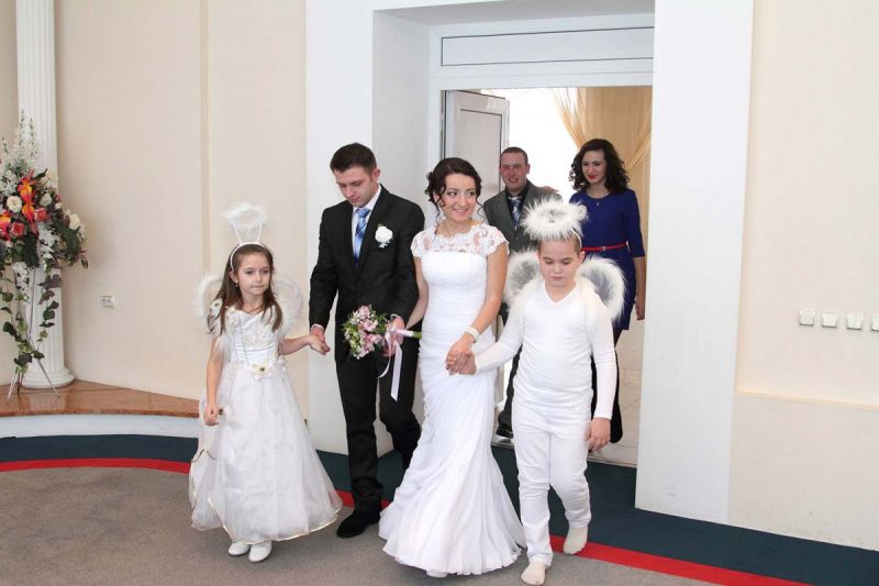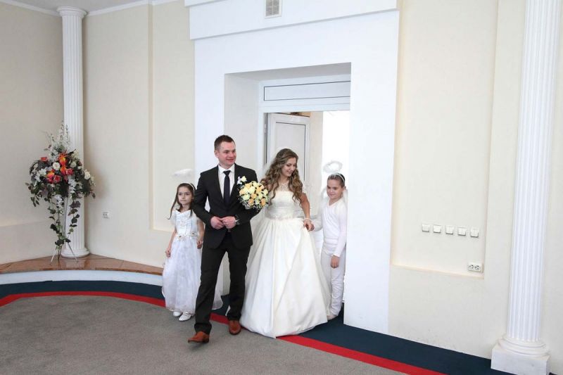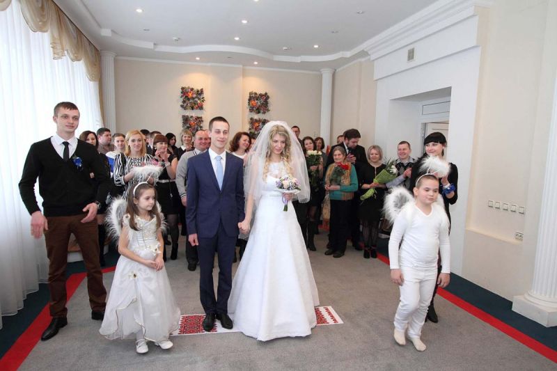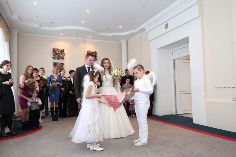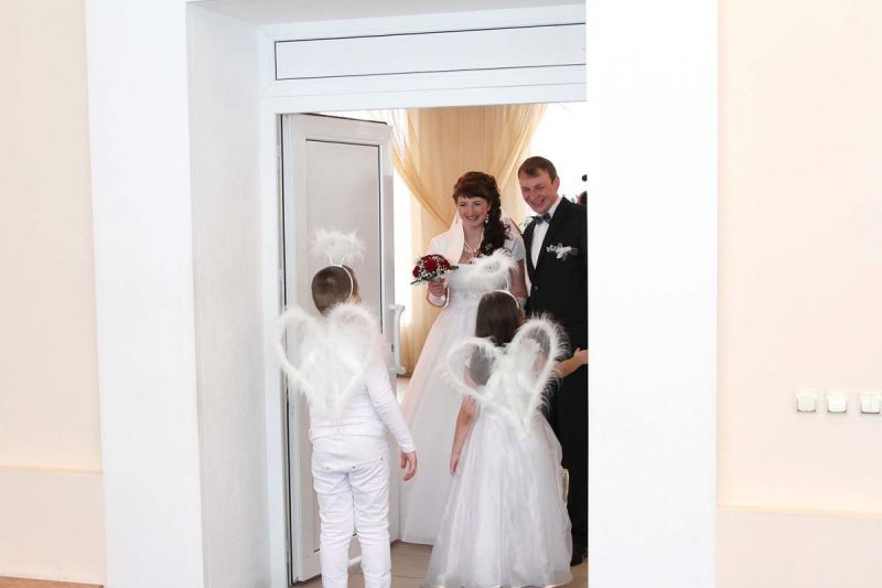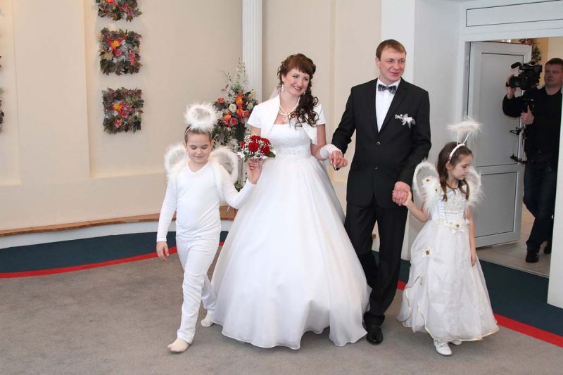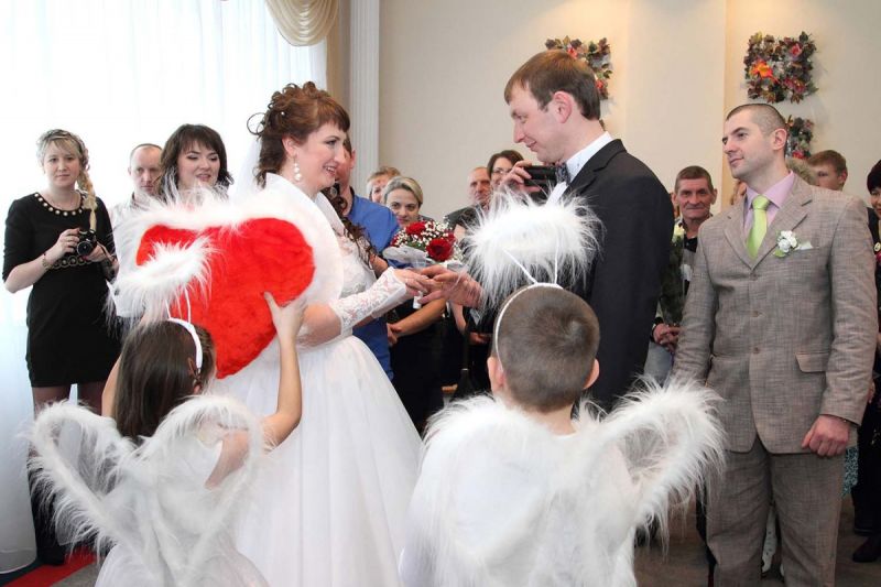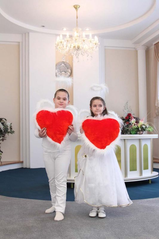 На пороге ЗАГСа молодоженов встречали два ангелочка, помощники святого Валентина. Каждая пара в подарок получила сердечко. Первый танец молодых – еще один подарок от молодежного центра «Импульс». Вживую песни для пар исполнял Михаил Азаренко.