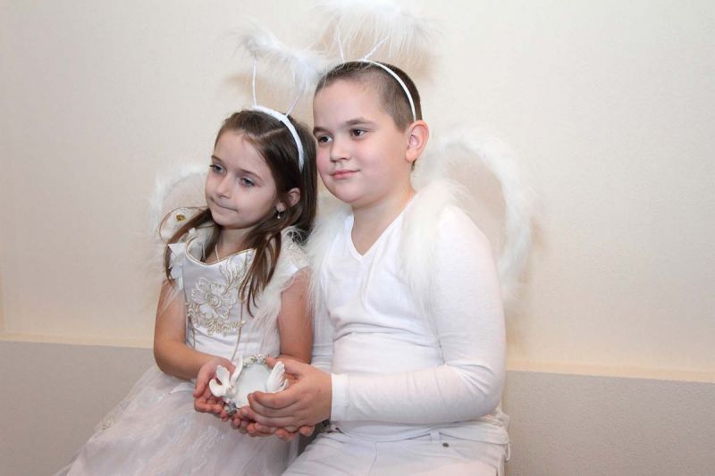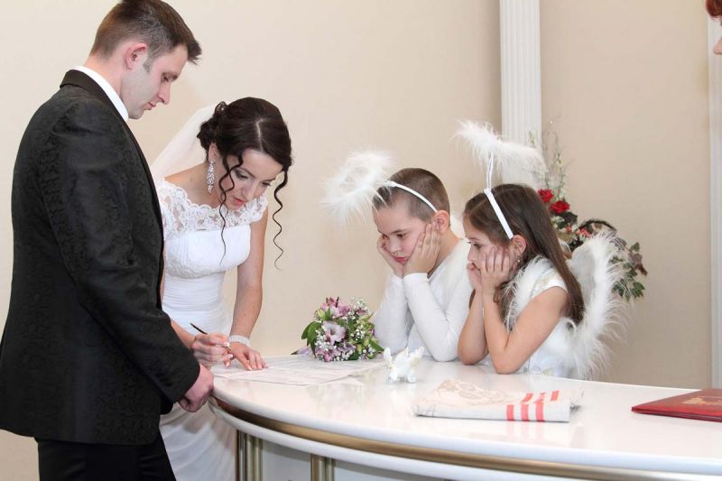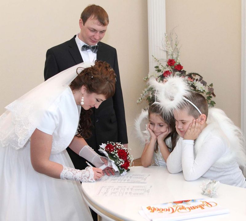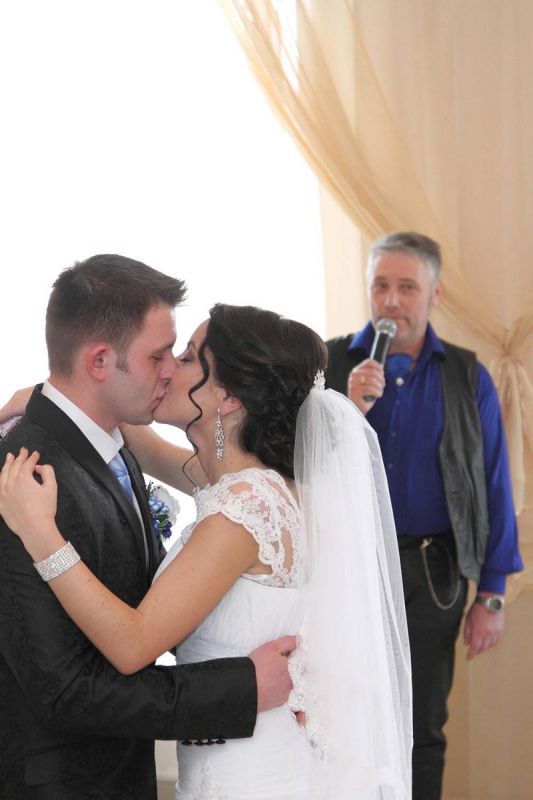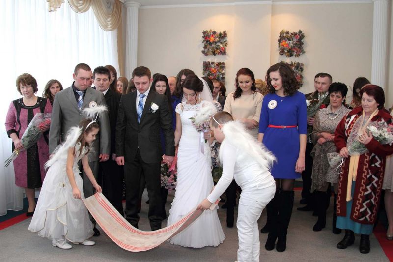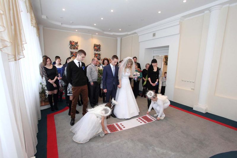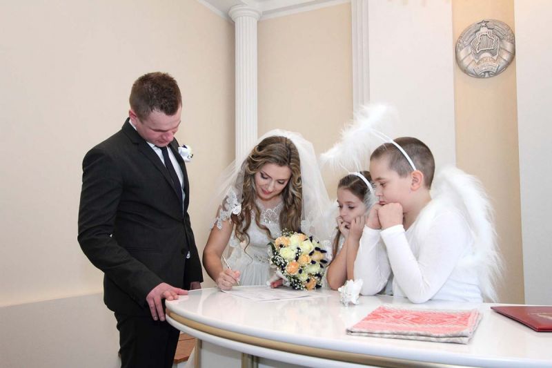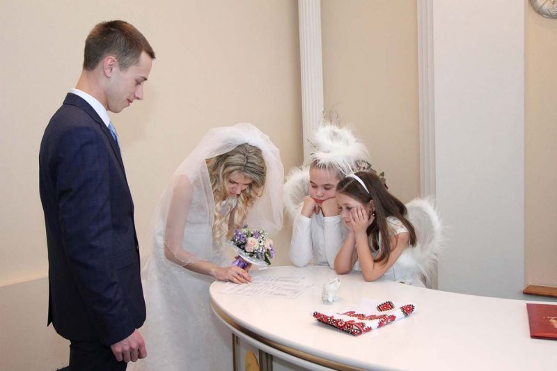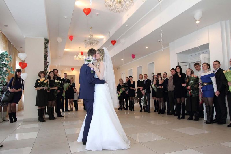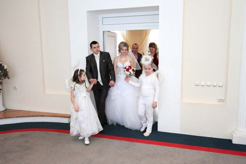 На пороге ЗАГСа молодоженов встречали два ангелочка, помощники святого Валентина. Каждая пара в подарок получила сердечко. Первый танец молодых – еще один подарок от молодежного центра «Импульс». Вживую песни для пар исполнял Михаил Азаренко.