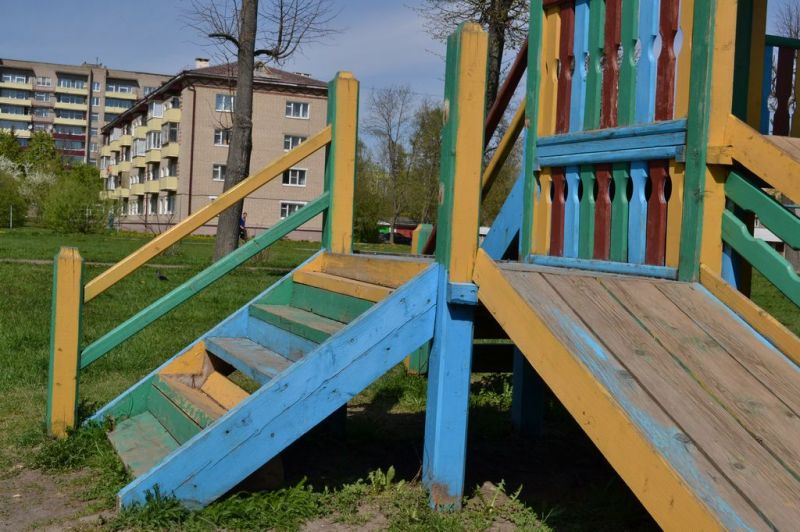 На этой площадке стоит деревянная горка, у которой частично отсутствуют перила. Бегая по горке, малыш всегда может оступиться, упасть с нее на землю и получить травму, даже несмотря на малую высоту.