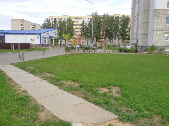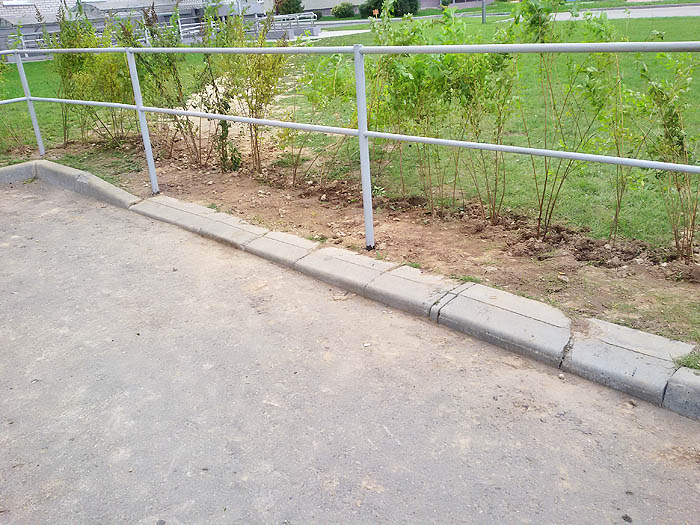 – Бордюр на другом конце тропинки занижен, наверное, планировалось, что дорожка здесь будет полноценная, облагороженная по всем стандартам. И это было бы правильно, ведь здесь безопаснее всего ходить от магазина к общежитию, например, мамам с колясками. Однако недели две назад путь пешеходам неожиданно преградили появившиеся кусты, а еще через некоторое время – и забор. Теперь приходится идти по дороге кругом или карабкаться на высокий бордюр, от которого недавно проложили тропу из плит (кажется, далеко не новых).