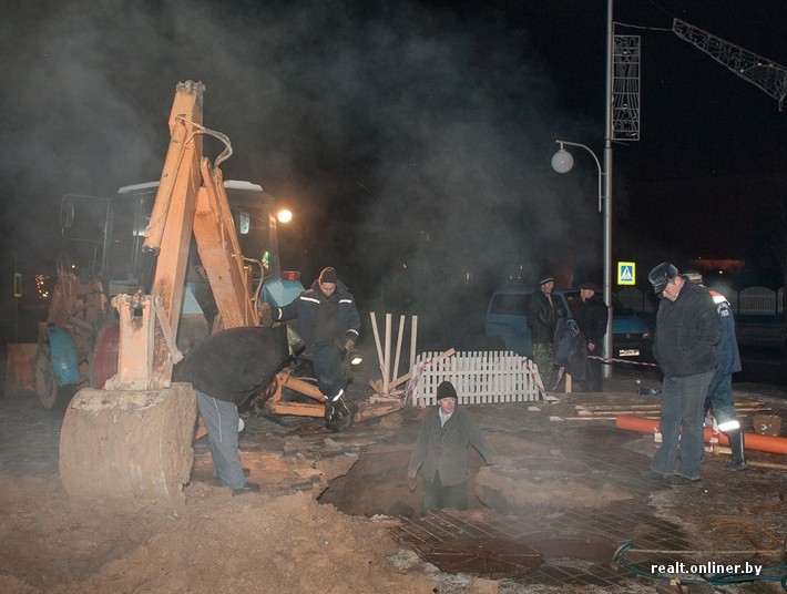 Инцидент произошел вечером 4 января на улице Якубовского в Горках, когда супруги возвращались домой. Уложенная к "Дожинкам" плитка ушла из-под их ног, и женщина оказалась сидящей в воде под землей. Через мгновение в яму глубиной 1,7-2 метра провалился и ее муж. Вода доходила ему до колена. Он вытолкнул жену из ямы, а затем выбрался сам. Сбежались люди, впоследствии прибыла скорая помощь, МЧС, милиция, представители райисполкома.
