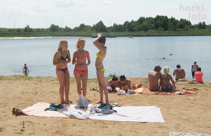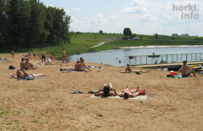 Территорию зоны отдыха благоустроили. Желтый пляж тянется вдоль берега метров на 300. Полежать и позагорать можно не только на песочке у воды, но и чуть повыше – на зеленой траве тоже есть удобные места. Те, кто предпочитают оставаться белокожими, могут расположиться и в тени деревьев. Дно озера в пляжной зоне песчаное, мягкое и довольно приятное на ощупь.