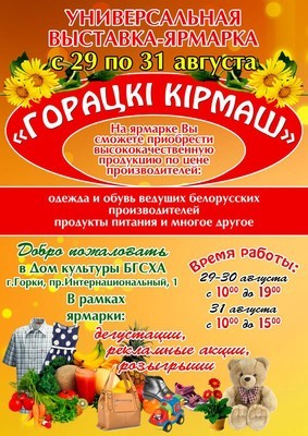 Хотите узнать больше? Приглашаем с 29 по 31 августа посетить "Горацкі кірмаш". Широкий ассортимент товаров отечественных производителей по низким ценам:одежда и обувь,