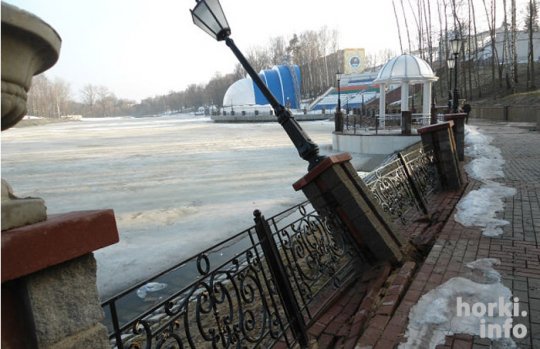 Хотите узнать больше? Каля амфітэатра ў Горках цяпер паваліўся слуп з ліхтаром вулічнага асвятлення. Ён, як тое дрэва, з коранем вывернуў плітку, у якую закавалі берагі