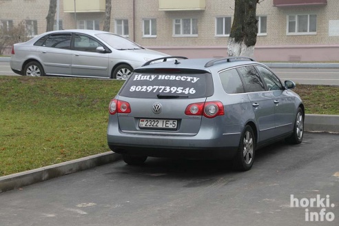 Хотите узнать больше? На одной из улиц Горок был припаркован автомобиль, хозяин которого ищет невесту. Об этом на окне авто имеется соответствующая надпись. Водитель