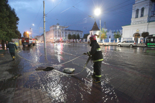 На снимке: сотрудники МЧС ликвидируют затопление на пересечении улиц Первомайской и Тимирязевской.Фото Олега Фойницкого, БелТА.