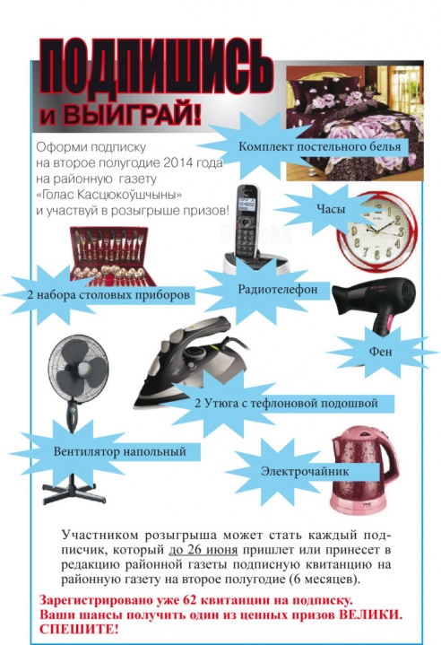 Хотите узнать больше? Поспешите оформить подписку на районную газету «Голас Касцюкоўшчыны» на второе полугодие 2014 года и выиграйте один из десяти ценных призов.