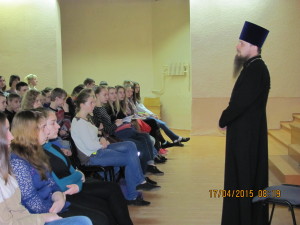 В актовом зале средней школы № 4 города Костюковичи состоялась встреча учащихся 8-х классов с настоятелем Свято-Мариемагдалинского храма протоиереем Михаилом