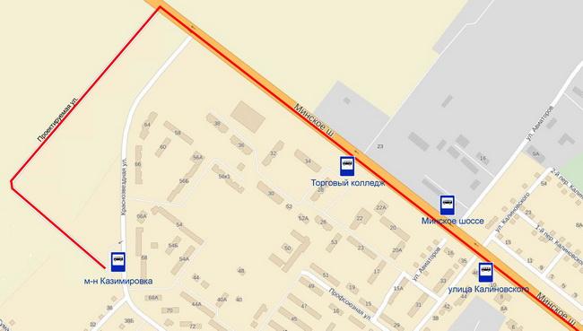 Высадка пассажиров при движении из центра города будет осуществляться на остановочных пунктах «Минское шоссе», «Микрорайон Казимировка».
