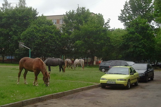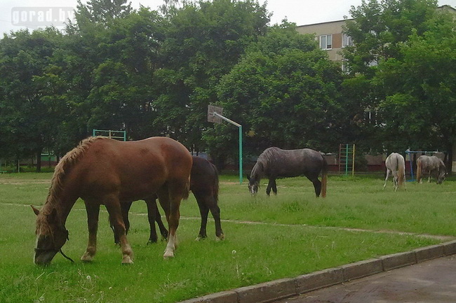 Сегодня их заметили в районе бульвара Непокорённых. Лошади не только паслись на дворовых газонах, но и с любопытством исследовали содержимое мусорных баков.