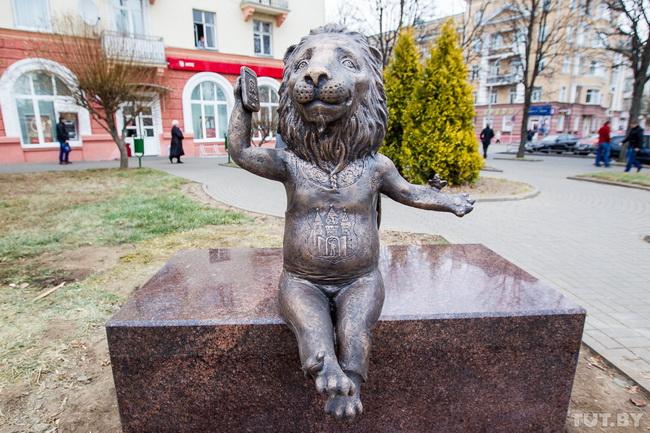 — Гэта наш гарадскі Леў — ён ужо паважлівы, пражыў жыццё. Ён патрыёт, вельмі любіць наш горад, і ён — член нашай каманды. Аб гэтым кажа надпіс ззаду майкі і герб горада на жывоціку. Тэлефануе ён маме ў Афрыку. Ён расказвае матулі, як яму тут добра, — паведаміў стваральнік скульптуры Андрэй Вараб’ёў парталу tut.by.