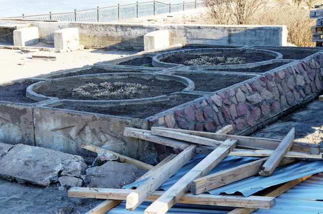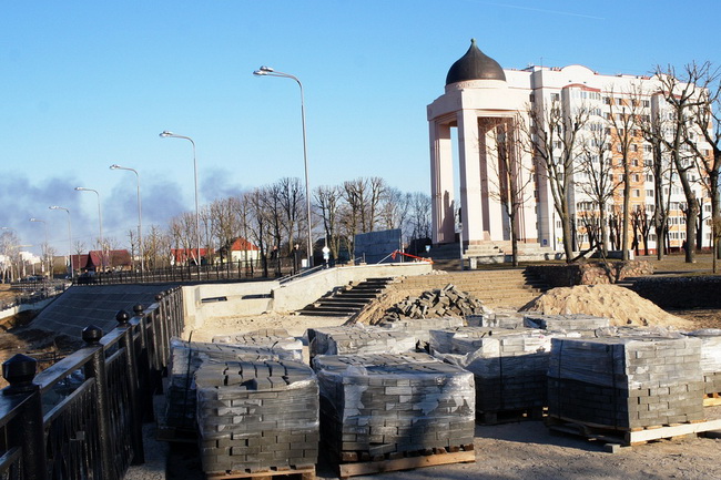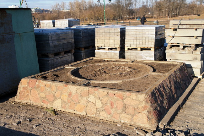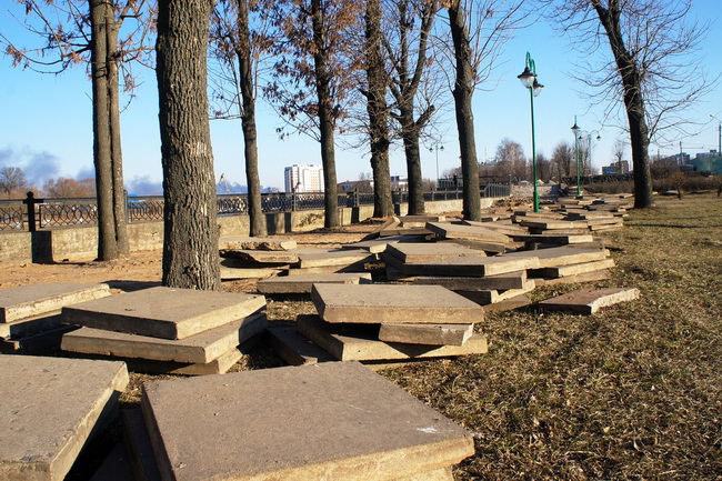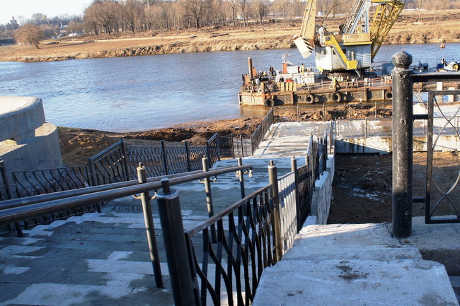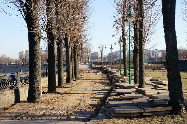 На подходе к реке уже появилась лестница. Вдоль набережной меняют плитку.