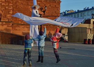 Возле театра выступили фаерщики, ходулисты и Jazz City Band