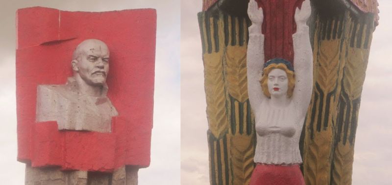 Из интересностей на мстиславской части можно отметить родник в низине между деревнями Чернилово и Шамовщина (вода нам не понравилась, теплая да и по вкусу на родниковую не похожа, брать ее не стали), саму Шамовщину, застроенную советскими типовыми домиками с шестиугольными окошками на чердаках, и советское наследие – монументы с названиями колхозов. Причем истуканы эти стоят на одном перекрестке прямо напротив друг друга. Ильич (колхоз "Ленинский путь") видимо задумался о чем-то, а Беларусочка (колхоз "Советская Белоруссия") руками машет, внимания к себе требует.