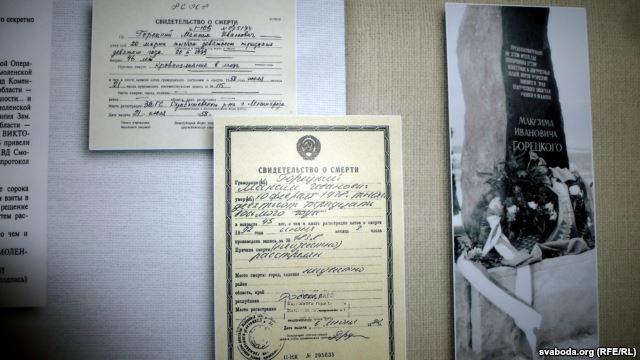 «Заўжды задаюць пытаньні, чаму на стэндзе два пасьведчаньні аб сьмерці. Я адказваю, як і вам — ня ведаю. Паводле афіцыйнай інфармацыі, Максім Гарэцкі расстраляны. А паводле неафіцыйнай — кровазьліцьцё ў мозг. Памёр у Комі АССР у 46 год».