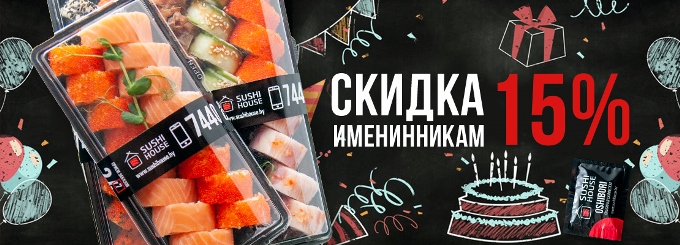 В день рождения и еще на протяжении четырех дней после него именинник может сделать заказ в неограниченном количестве, получив скидку в размере 15%. Акция не касается барной продукции и бэнто, действует отдельно от других скидок и программ.