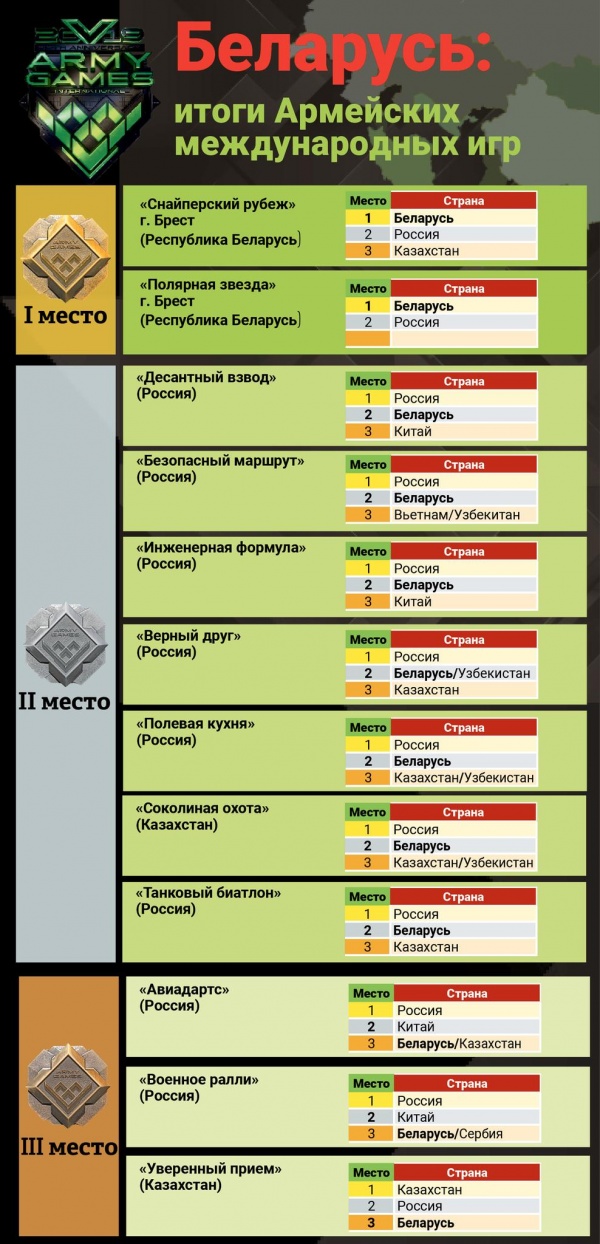 Всего в играх белорусские военные выступили в 18 конкурсах: «Танковый биатлон», «Полевая кухня», «Верный друг», «Военно-медицинская эстафета», «Отличники войсковой разведки», «Десантный взвод», «Инженерная формула», «Суворовский натиск», «Чистое небо», «Авиадартс», «Военное ралли», «Безопасный маршрут», «Мастера артиллерийского огня», «Соколиная охота», «Уверенный прием», «Воин мира», «Снайперский рубеж» и «Полярная звезда».