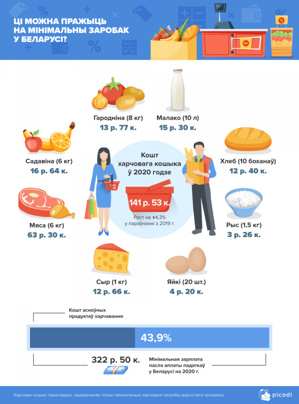 Стоимость минимальной продовольственной корзины равна 43,9% от минимальной зарплаты. Такая же корзина в прошлом году составляла 47,8% тогдашней минимальной оплаты труда. Это означает, что рост зарплат в Беларуси опередил рост цен.