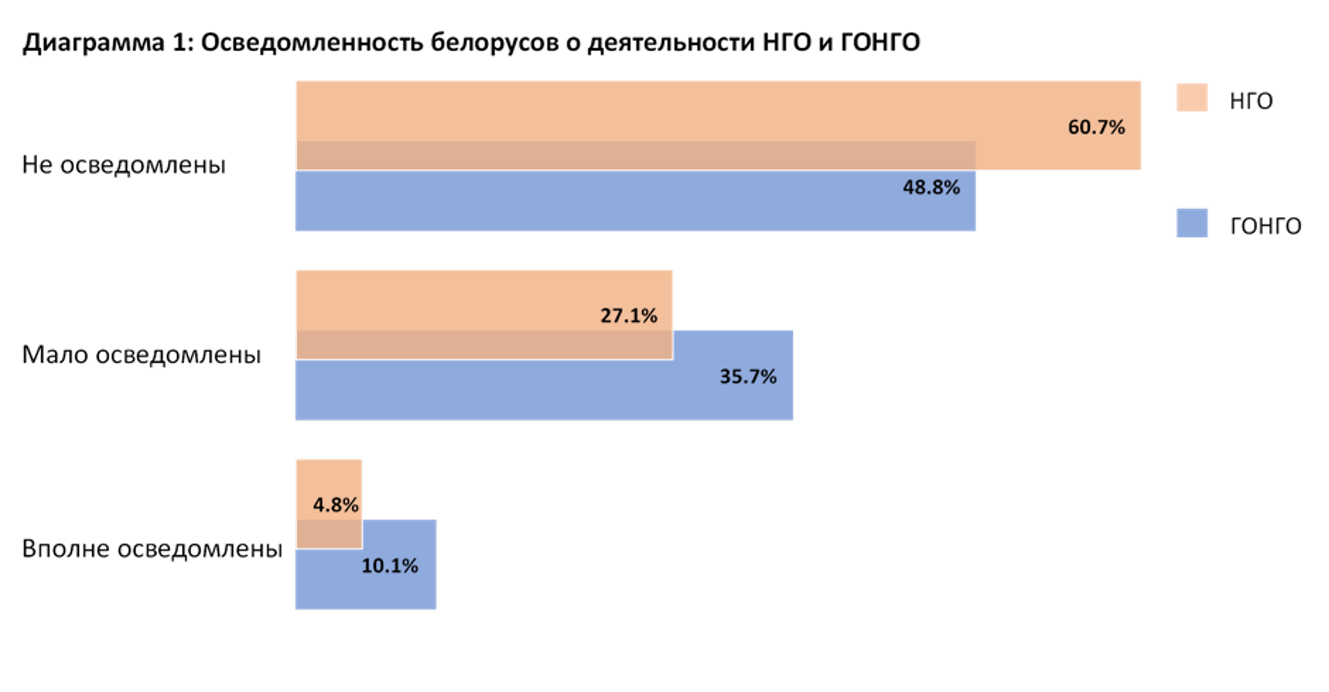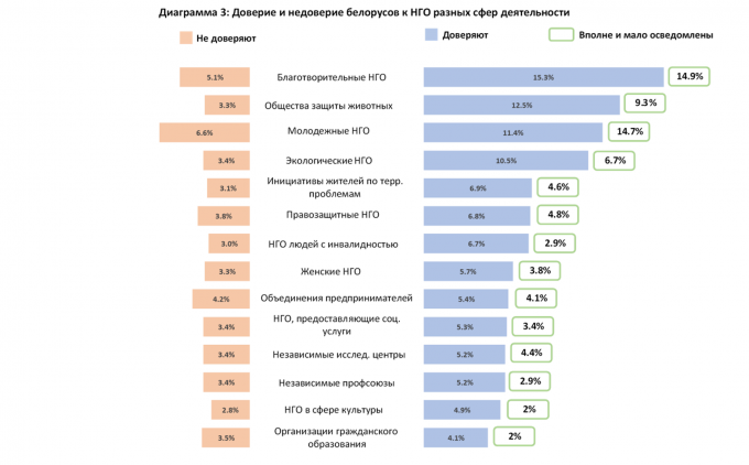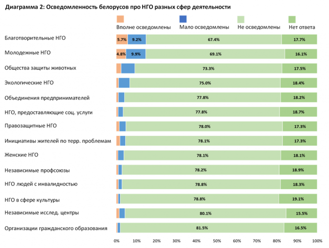 Опроспоказал, что большинство белорусов не осведомленыили мало осведомлены о деятельности как негосударственных общественных организаций, так и государственно-общественных организаций. Последние часто называют ГОНГО – организации, формально являющееся негосударственными, но фактически созданные государством и при государственной поддержке (например, Белорусский республиканский союз молодежи, Белая Русь и др.).