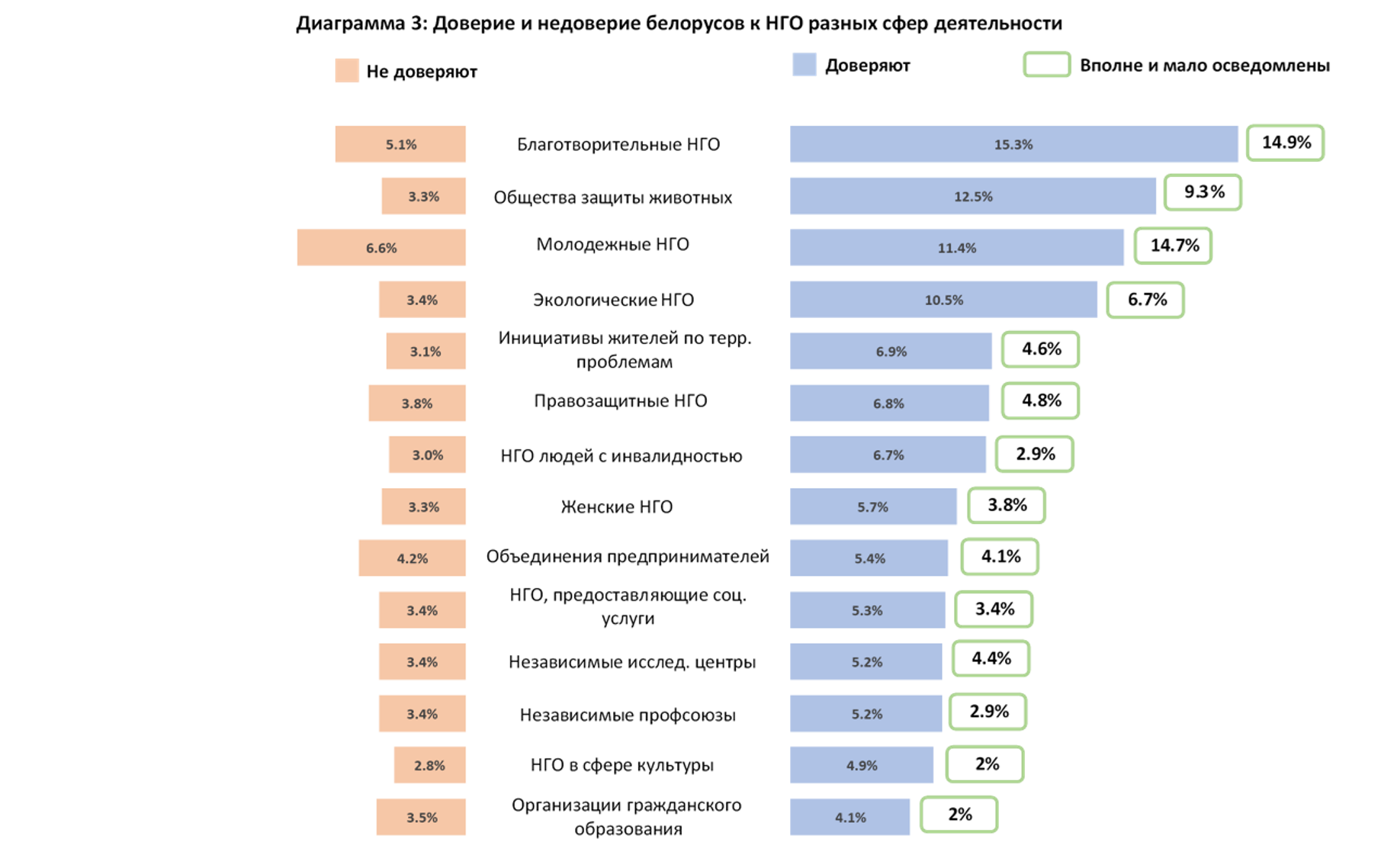 Диаграмма 3 явно показывает, что больше всего люди доверяют тем же четырем группам НГО, которые заняли лидирующие позиции и в рейтинге осведомленности – благотворительные, молодежные, экологические и общества защиты животных.
