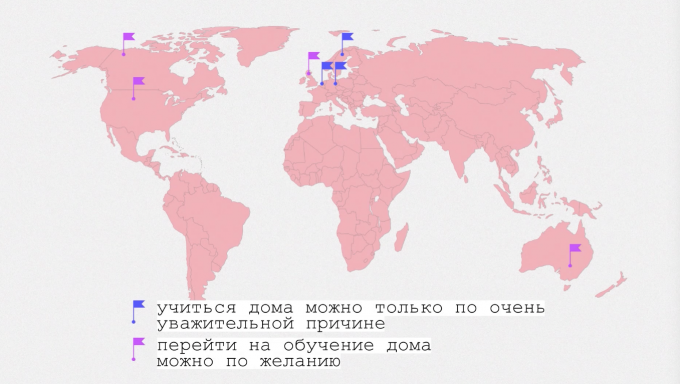 В Украине, например, дома учится 54 тысячи школьников – где-то 1,5% от всех, в России – 85 тысяч, примерно 0,5%. В мире нет однозначного отношения к обучению на дому: например, в Нидерландах, Германии или Швеции учиться дома можно только по очень уважительной причине, а вот в США, Великобритании, Канаде или Австралии нет никаких проблем с тем, чтобы перейти на обучение дома, – было бы желание.