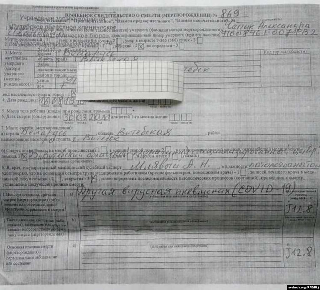Также 1 апреля стало известно, что 30 марта скончалась 73-летняя жительница Витебска - Александра Чепик. С диагнозом "пневмония" ее госпитализировали в больницу, где она находилась в течение 2 недель. Первое время женщина могла дышать самостоятельно, позже - только с помощью аппарата ИВЛ. По информации из медицинских документов, опубликованных "Радыё Свабода", тест Александры на коронавирус дал положительный результат.