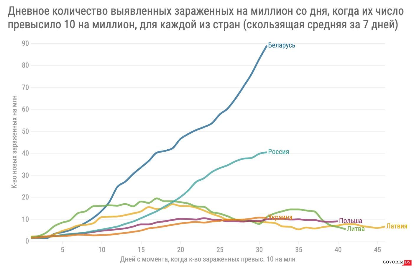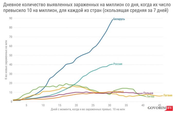 Я был в марте и в Беларуси, и в Литве. На фоне происходящего в Беларуси, Литву на моих глазах аккуратно и быстро, буквально одним днем прикрыли на карантин при всего-то 8 выявленных к тому моменту случаях заражения. Сейчас Литва уже открывается снова, как те же Чехия, Австрия, Польша и т.д. А белорусская экспонента всё ещё загибается вверх.