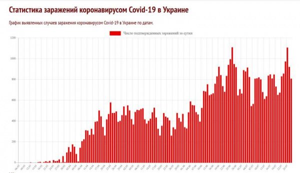 В субботу, 25 июля 2020 года,там было зафиксировано второе пиковое значение выявленных больных за все время наблюдений. За сутки было зафиксировано 1106 заразившихся COVID-19, больше было только 26 июня (1109 заразившихся). И хотя общее количество заразившихся в Украине на уровне Беларуси (несмотря на значительную разницу населения), коронавирус сейчас там на подъеме. Всего в Украине на данный момент зафиксировано 65656 заразившихся, из которых 27928 находятся в активной фазе.