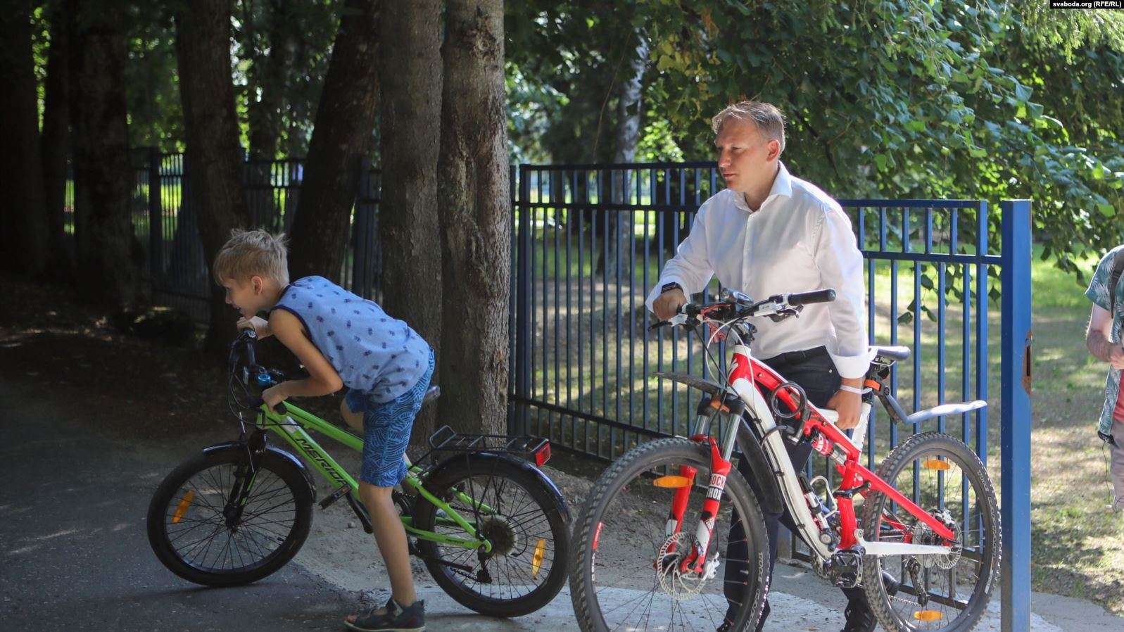 Андрей Дмитриев приехал голосовать в деревню Волковичи Дзержинского района на велосипеде, с сыном. У кандидата в президенты на руке белая лента.