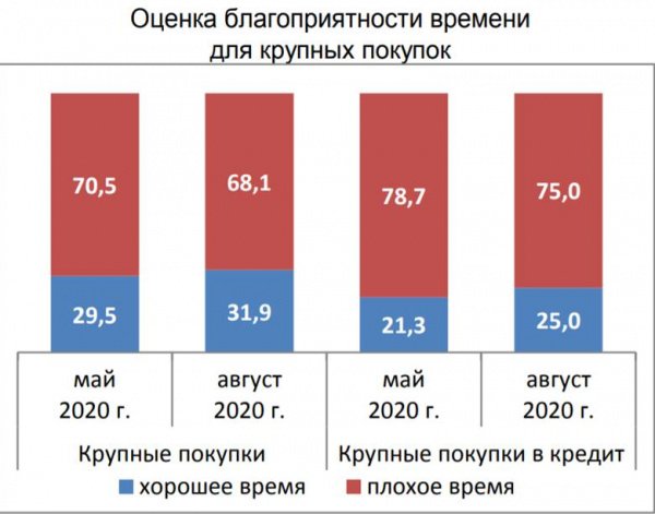 В соответствии с ожидаемым ростом цен изменились и настроения потребителей. С одной стороны, стало расти количество тех, кто считает, что сейчас хорошее время для крупных покупок как в кредит, так и за свои средства. С другой, стало снижаться количество людей, считающих нынешнее время хорошим для сбережений.