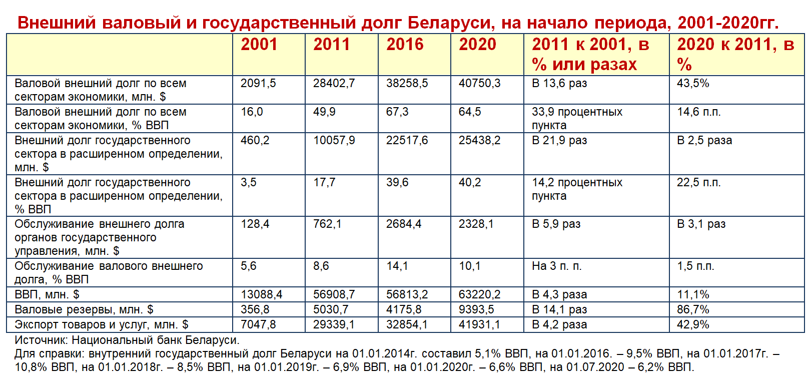 Для сравнения в период 2001 – 2011гг. ВВП Беларуси в $-долларом выражении вырос в 4,3 раза, в период 2001 – 2020гг. – в 4,8 раза. С учётом тенденций 2020г. ВВП в 2020г. будет меньше, чем по итогам 2010г., а государственный долг будет более чем на 20% больше.