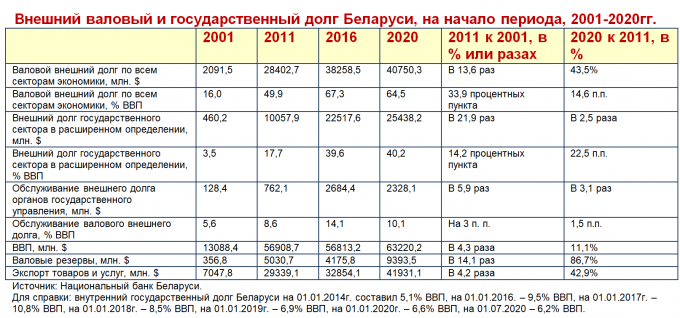 Денежная разнузданность белорусских VIP-распорядителей чужого затянула страну в опасную долговую ловушку. В период 2001 - 2011 (на начала периода) валовой внешний долг Беларуси вырос в 13, 6 раз, за период 2001 – 2020гг. – в 19,5 раз. Внешний долг государства в расширенном определении в 2001 – 2011гг. вырос 21,9 раза, в 2001 – 2020гг. – в 55,3 раза.