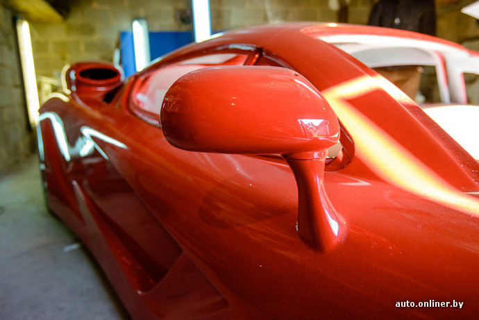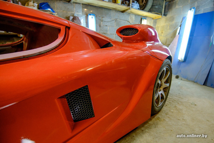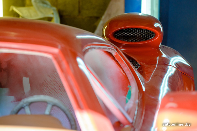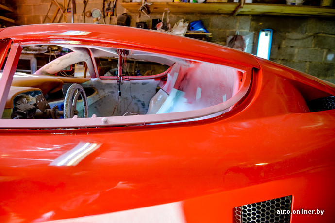 Работы было действительно очень много. Одновременно пришлось заняться как изготовлением рамы, так и воплощением чертежа кузова в реальность. Раму делал из прочного металла, вручную обрабатывал, сваривал и шлифовал. Кузов собирал собственноручно поэтапно из стеклопластика, небольшими частями.
