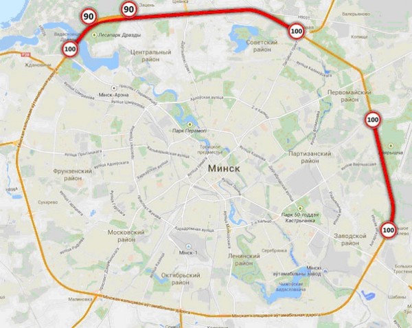 движения до 100 км/ч на участке от Логойского тракта до проспекта Победителей, за исключением участка внешнего кольца от 42-го до 44-го км МКАД в связи с конструктивными особенностями дороги. На разделительной полосе установят конструкции с дорожным знаком 3.24.1 "Ограничение максимальной скорости" и знаком дополнительной информации 7.14 "Полоса движения". Общая длина участков с повышенным скоростным режимом движения составит 39 км", – рассказала Татьяна Харлинская.