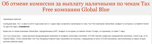 Компания Global Blue отменила введенную с 1 июля комиссию за возврат денег по чекам Tax Free.