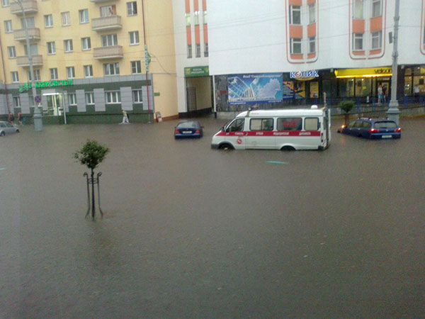 Сильные подтопления в районе третьей школы по улице Барыкина, Мохова переезда, Богдана Хмельницкого в районе военкомата - вода доходит до бампера машины.