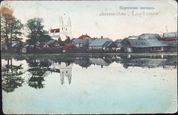 В декабре на аукционе ay.by была выставлена открытка, которую никто в Глубоком до сих пор не видел. На ней изображены застройка поселка и костел Святой Троицы, которые отражаются в спокойной глади Кагального озера. Видна на открытке и синагога, которая была разрушена немцами во время последней войны. Уже после войны была снесена и местечковая застройка – там возник консервный завод.