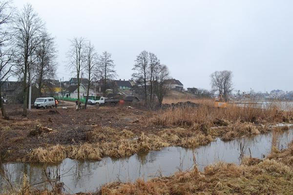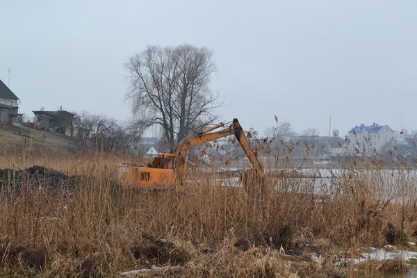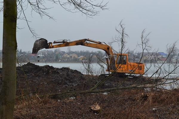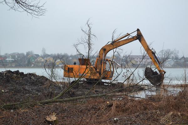 Экскаватор начал чистить берег озера со стороны улицы Народной. Также были вырезаны деревья и наведен порядок на месте впадения речки в озеро.