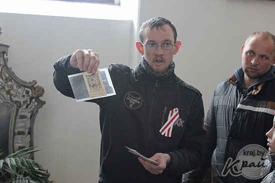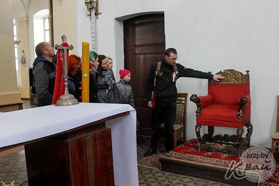 После этого экскурсанты отправились в костел. Кастусь Шиталь рассказал о многих иконах, которые находились в храме. Здесь также есть и портрет Иосифа Корсака, изображения многих ксендзов. Можно было увидеть и чудодейственную икону Девы Марии и скульптуру Иисуса Христа XVIII века.