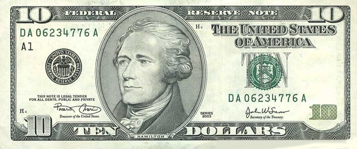 Сейчас на 10-долларовой купюре изображен первый министр финансов США Александр Гамильтон.