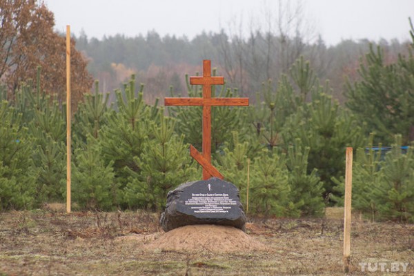 Крест и камень, установленные на месте будущего храма, на пригорке в деревне Станчики