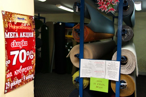 Наша акция заключается в том, что во время распродажи клиенты могут купить у нас ковролин по цене 10 рублей за квадратный метр – и тот, который раньше стоил 35 рублей за квадратный метр, и тот, который в обычные дни можно приобрести за 22 рубля.