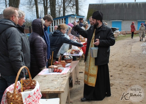 В субботний день католики приходили в храм помолиться у гроба Христова и в течение этого дня освящали пасхальные яства: булки, мясные изделия, соль и крашеные яйца. А накануне светлого праздника в костеле Воздвижения Святого Креста прошло пасхальное богослужение с обрядом освящения огня и воды.