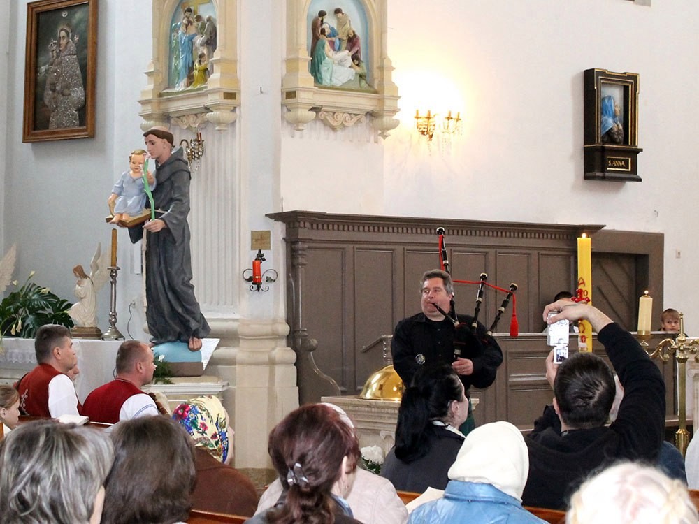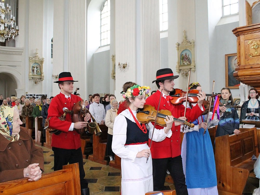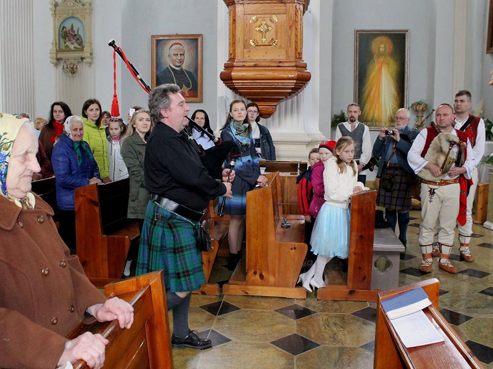 Потом дудари приняли участие в торжественном богослужении в храме Непорочного Зачатия Пресвятой Девы Марии в деревне Удело.