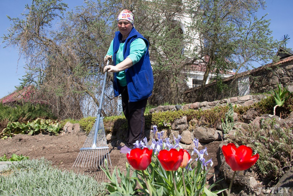 Экскурсовод Мария Ткаченок делает клумбу возле костела