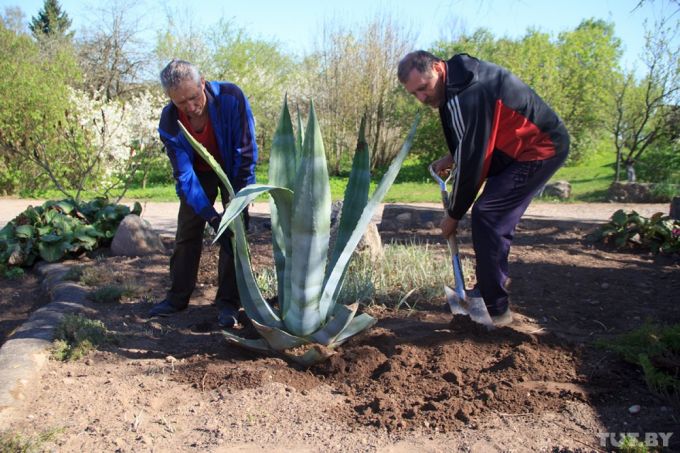 Из каждой поездки ксендз Юозас привозил в свой Мосар саженцы цветов и деревьев. Многие виды растений в дендропарке сохранились еще с тех, «бульковских», времен. Например, вот эта агава. Мужчины, среди которых заведующий культурно-дендрологическим комплексом Сергей Лавринович, заботливо подбирают место, куда посадить огромное тропическое растение.