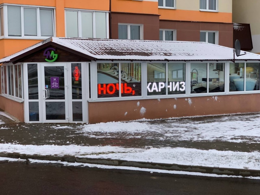 Салон-магазин расположен рядом со стелой Божьей матери, по левую сторону, если едешь в направлении Минска. Красочная бегущая строка на фасаде с подробным перечнем товаров сразу привлекает внимание.