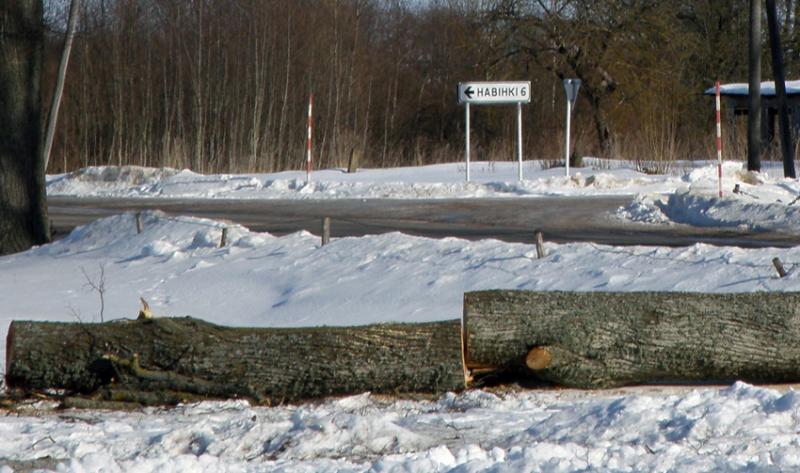 Вёска Казлоўшчына (Пастаўскі р-н). Вельмі сімвалічная дарожная шыльда на тле спілаваных паркавых прысадаў – “Навінкі -6 км.”